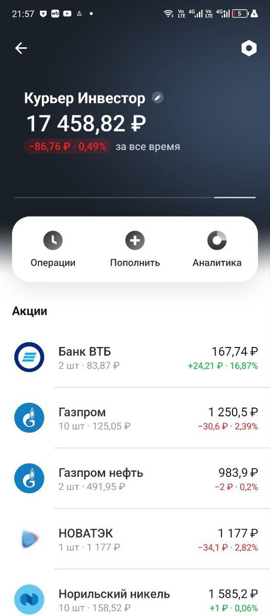 Сегодня очередной день пополнения счета. Без суеты, без попыток «угадать рынок» и спекуляций. Только долгосрочная стратегия. А так как пока пришла только половина денег за смены, то по своим правилам (инвестирую 50% от дохода с курьерства) внес сегодня 6 000 рублей. 💼 Мой портфель «Курьера Инвестора» сегодня: