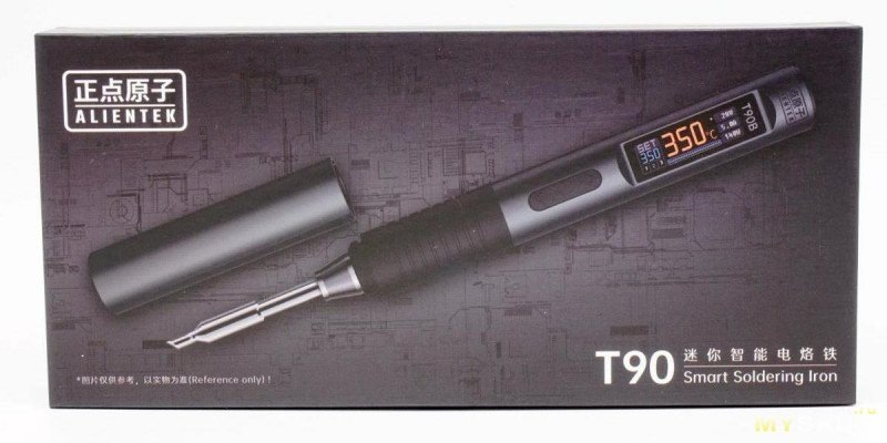 Alientek T90B поставляется в компактной чёрной коробке с логотипом бренда и изображением паяльника. Упаковка выглядит стильно и надёжно – ничего лишнего, но всё аккуратно защищено от повреждений во время транспортировки. Внутри вы найдёте: