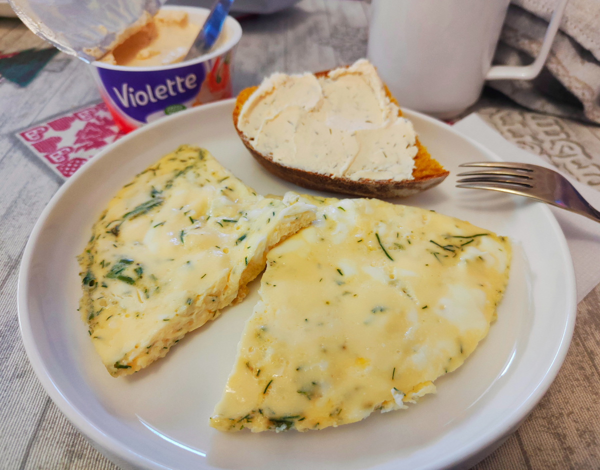 Омлет с укропом; бутерброд с творожным сыром; кофе;