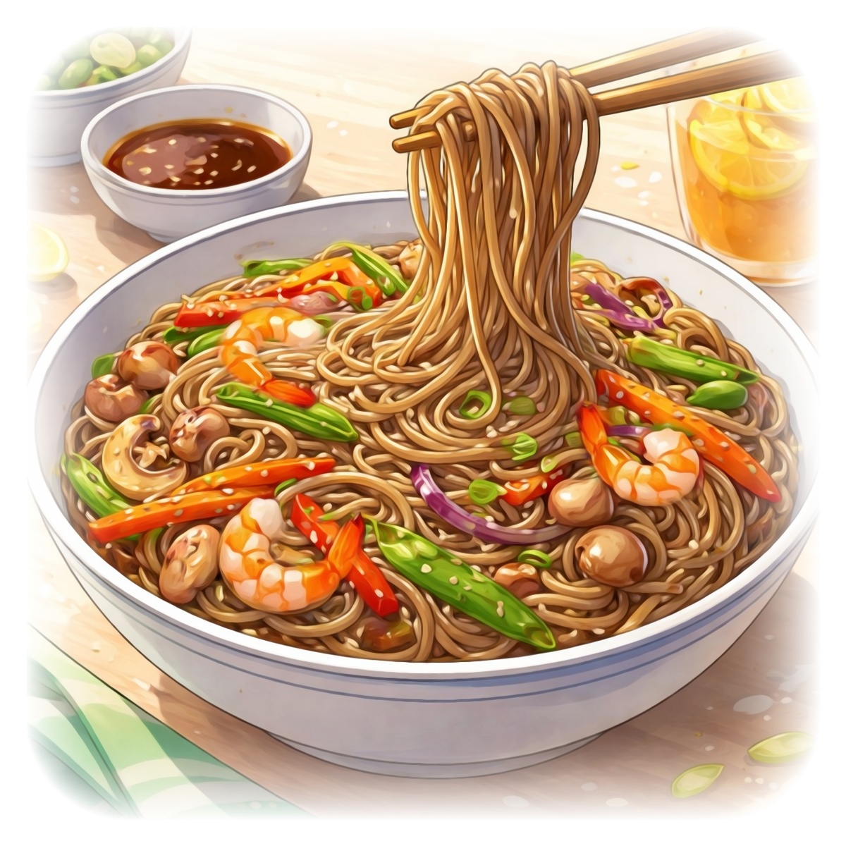 Идём вместе с бывшей коллегой, заведение выбирала она, но я поняла, что давненько не едала якисобу — это блюдо на основе гречневой лапши, овощей, может быть с курицей или с рыбой, соба со многими продуктами хороша и даже пустая с соевым соусом. 😋 В принципе я её и дома могу приготовить, что периодически и делала в незапамятные времена.