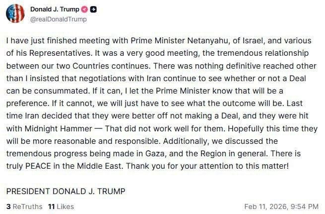 : «Я настоял на продолжении переговоров с Ираном, чтобы выяснить, можно ли заключить сделку. Если это удастся, я сообщил премьер-министру, что это будет предпочтительным вариантом. Если нет, нам просто придется посмотреть, каким будет результат. В прошлый раз Иран решил, что ему выгоднее не заключать сделку, и они столкнулись с «Полуночным молотом» – это не сработало для них. Надеюсь, на этот раз они будут более разумными и ответственными Trump: „Ich habe darauf bestanden, die Verhandlungen mit dem Iran fortzusetzen, um zu sehen, ob ein Abkommen möglich ist. Sollte das gelingen, habe ich dem Premierminister gesagt, dass dies die bevorzugte Option wäre. Wenn nicht, müssen wir abwarten, was dabei herauskommt. Beim letzten Mal entschied sich der Iran gegen ein Abkommen und wurde dafür hart bestraft – das ging nach hinten los. Ich hoffe, dass sie diesmal vernünftiger und verantwortungsbewusster handeln.“