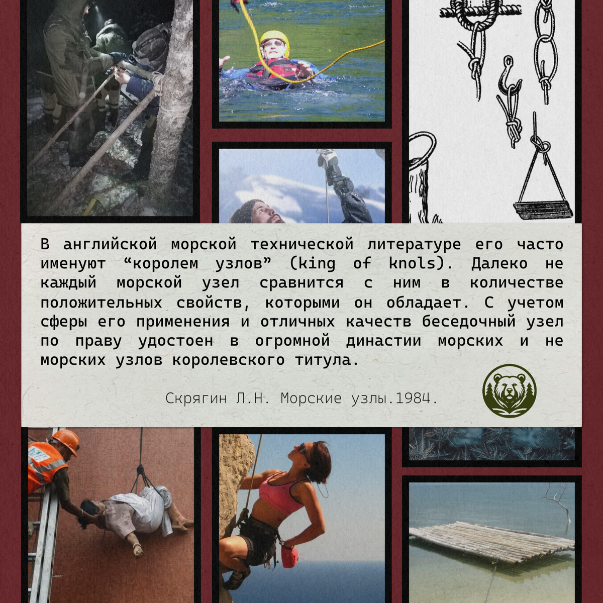 Если бы у меня был выбор, какому одному узлу научиться для последующего применения, в том числе и в ситуациях выживания, я бы выбрал булинь. С помощью данного узла можно: - создать спасательную петлю, при помощи которой можно либо вытянуть человека откуда-нибудь (ущелье, колодец, река, море и т.д.), либо опустить куда-нибудь (по склону, из горящей многоэтажки и пр.). В том числе сделать что-то типа люльки; - закрепить палатку/тент/пончо, в общем какое-нибудь укрытие, привязав оттяжку либо верёвку к дереву/колышку/камню; - привязать лодку или плот к дереву/камню; - создать петли для ног при подъёме, допустим на дерево, с помощью верёвки; - связать между собой две верёвки; - привязать импровизированные носилки (например из плащ-палатки) к палкам. Что касается вопросов выживания и обвязывания вокруг себя верёвки при помощи этого узла, стоит сказать, что необходима определённая практика в завязывании беседочного узла (ещё одно название булиня) одной рукой. Легко представить ситуацию, когда