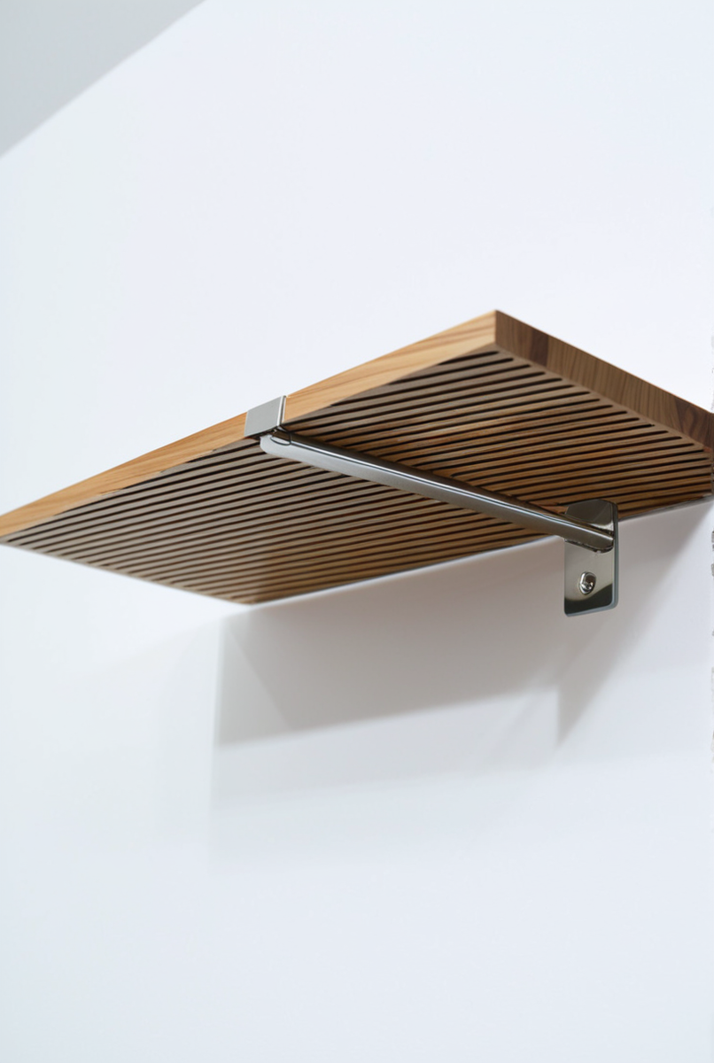 Ключевое правило, чтобы выбрать полкодержатель: стальной штырь должен входить в полку на 2/3 ее глубины․ Если глубина полки 250 мм, штырь должен заходить внутрь на 160-170 мм․ Важна и толщина полки: она должна быть больше диаметра штыря․ Это важно для надежного потайного монтажа полки из МДФ или массива дерева․