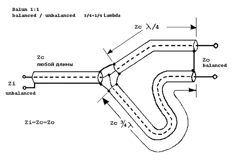 🔹 В этом балуне используются переходные секции на ¼ и ¾ длины волны, подключенные к коаксиальному кабелю с сопротивлением 50 Ом (Zc) или к коаксиальному кабелю с необходимым импедансом. 🔹 Поскольку электрическая длина обеих секций включает в себя коаксиальный трансформатор на ¼ длины волны и если несимметричный импеданс имеет то же значение, что и коаксиальный кабель, то импеданс на других концах будет точно таким же. 🔹 Поэтому он и называется балуном 1:1. Читать далее >>