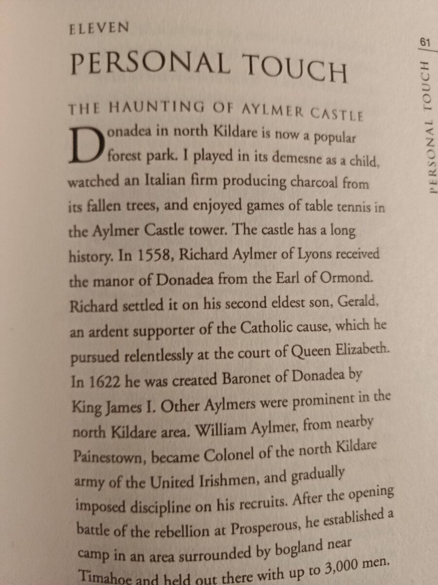 Донадеа в северном Килдаре ныне популярный лесной парк. Будучи ребёнком, я играл в этих владениях, наблюдая, как итальянская фирма добывает уголь из упавших деревьев и наслаждаясь игрой в настольный теннис в башне замка Айлмер.
