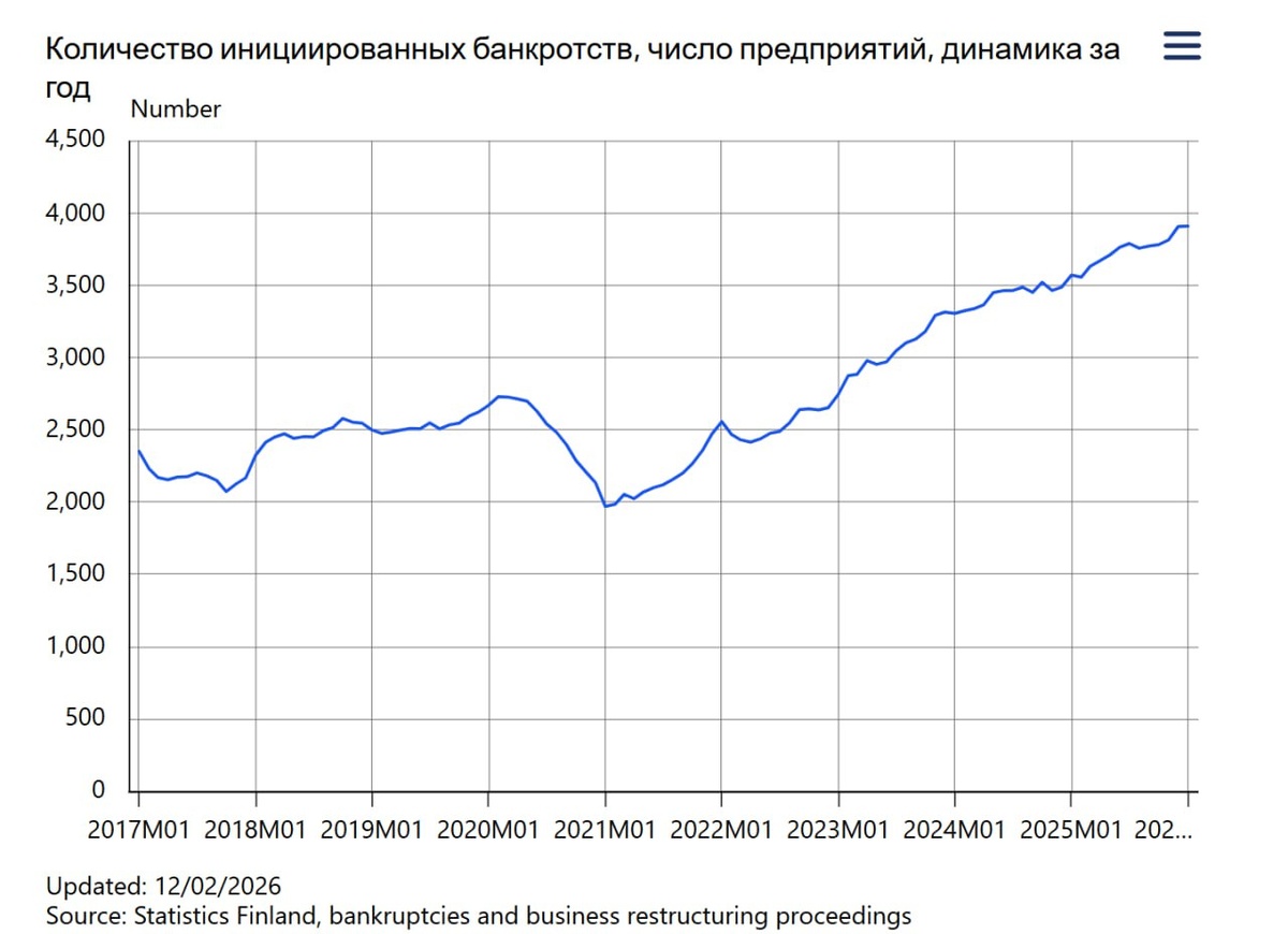 В Финляндии зафиксирован самый высокий за 29 лет уровень банкротств: в январе 2026 года было возбуждено 385 соответствующих дел — последний раз такая цифра наблюдалась в 1997 году. Немецкие аналитики предупреждают, что страна скатывается от стагнации к полноценному спаду. Кризис, спровоцированный разрывом экономических связей с Россией, лишь набирает обороты. При этом значительные ресурсы продолжают направляться на военные нужды, а не на поддержку бизнеса и граждан, что усугубляет ситуацию. Дядька Гарри. Подпишись! https://max.ru/UnknownWitnessTV
