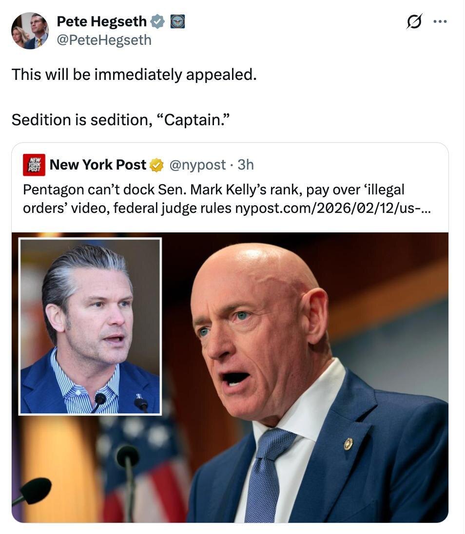 Hegseth MOCKS Mark Kelly’s rank after saying he will APPEAL the federal judge’s ruling that the Pentagon cannot dock Kelly’s rank or pay over the Seditious Six video