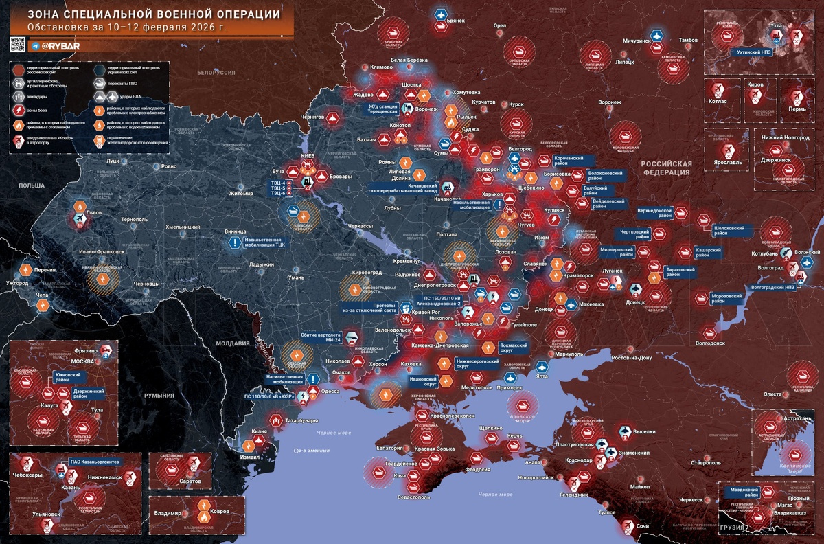 📝 Что мы видим на картах за 10-12 февраля 2026 года? Российская армия продолжает наносить удары по критической инфраструктуре противника. Киев, Львовская, Ивано-Франковская области, Одесса и центральные регионы – энергетическая система т.н. Украины трещит по швам. В прифронтовой зоне тоже не дают скучать – "Герани" и ракеты метко бьют по тыловым целям. Но не будем забывать и о наших границах. Белгород продолжает страдать от обстрелов и атак БЛА. Украинский режим пытается посеять панику и создать кризис в приграничных регионах. К счастью, ПВО работает, перехватывая большую часть ракет, как, например, пять из шести "Фламинго", направленных в Волгоградскую область. На Восточно-Запорожском направлении наши войска отражают атаки противника, который стянул туда серьезные силы – штурмовые полки и десантные подразделения. На Запорожском направлении идут тяжелые бои в окрестностях Степногорска, где группировка "Днепр" формирует клинья в западном фланге. В целом, ситуация остается сложной,