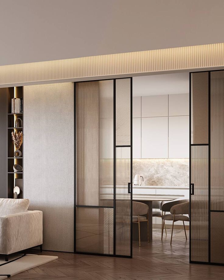 Почему это люкс: Такое стекло мягко рассеивает свет, превращая силуэты в эстетичные тени. Оно идеально подходит для отделения гардеробных или кухонных зон — вы видите игру света, но не видите бытовых подробностей.
