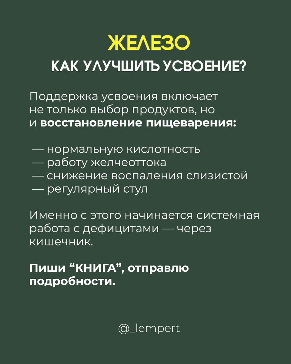 ❗️Даже при достаточном поступлении железа с пищей его усвоение напрямую зависит от состояния слизистой кишечника, уровня воспаления, кислотности желудка и состава микробиоты.