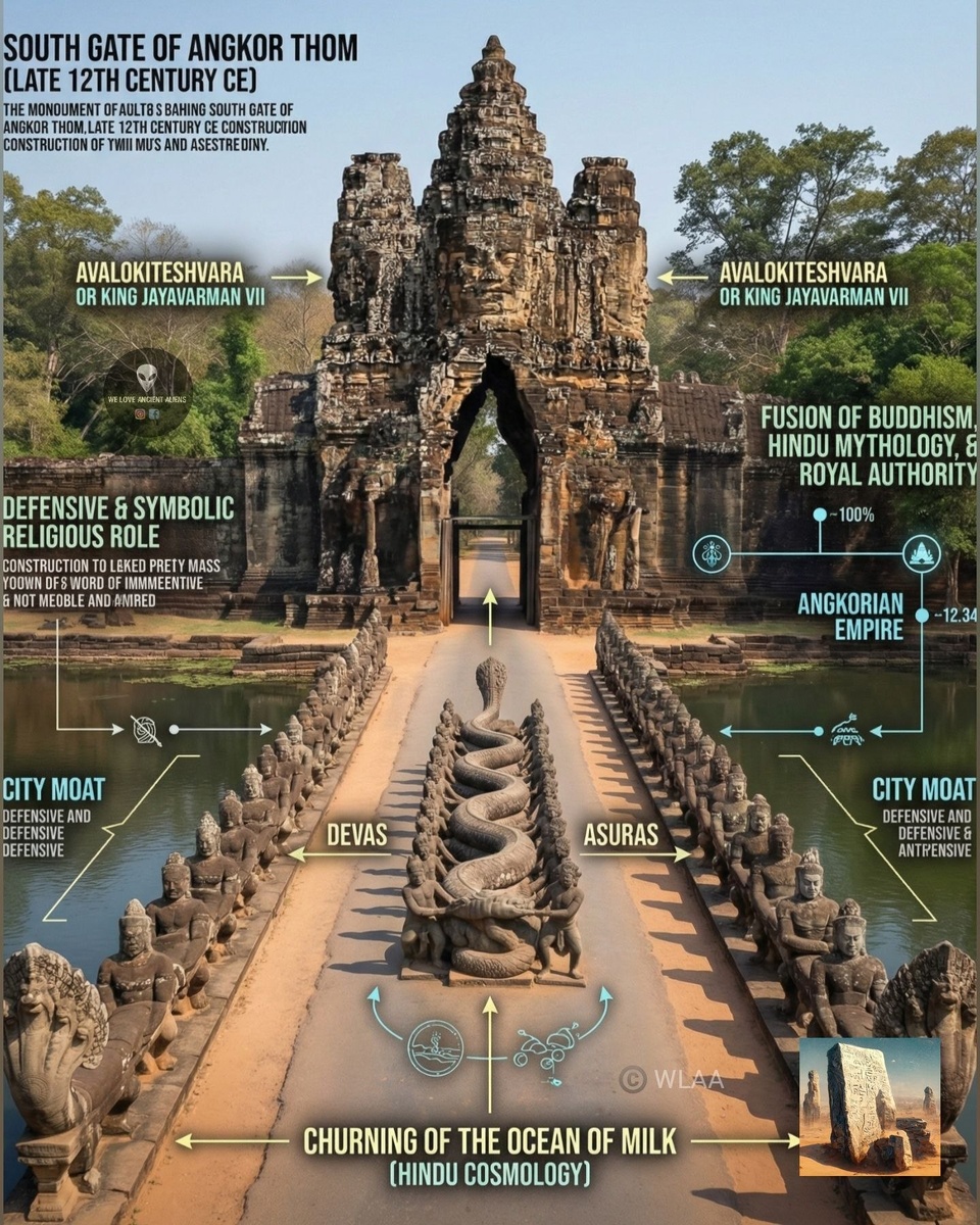 VII. Они являются одними из пяти главных ворот в укрепленный город Ангкор-Том на территории современной Камбоджи. Построенные из песчаника и латерита, ворота увенчаны четырьмя большими безмятежными гранями, обращенными по сторонам света, которые обычно интерпретируются как Авалокитешвара или обожествленное изображение самого царя. Дамба, ведущая к воротам, с каждой стороны украшена рядами каменных фигур, изображающих дэвов и асуров, тянущих за собой змею нага, символизирующую вспенивание молочного океана в индуистской космологии. Первоначально ворота, расположенные над городским рвом, сочетали в себе оборонительную функцию с мощной религиозной символикой, отражая слияние буддизма, индуистской мифологии и королевской власти, которые определяли Ангкорскую империю в период ее расцвета... Терра инкогнита | Неизвестная земля