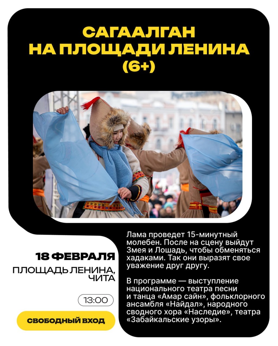 На площади Ленина развернут ярмарки, на которых можно будет купить традиционную атрибутику. Со сцены забайкальцев с Новым годом по восточному календарю поздравят участники СВО. В конце праздника все участники и зрители станцуют ёхор. Сагаалган в Агинском, Могойтуе и Дульдурге отпразднуют с 18 по 21 февраля. 💬Сагаалган отмечают буддисты по всему миру в день первого весеннего новолуния по лунному календарю. В 2026 году этот день выпал на 18 февраля. Праздник символизирует обновление природы и человека, переход к новому лунному году. (6+) 🟦 «Чита.Ру» в MAX | Предложить новость