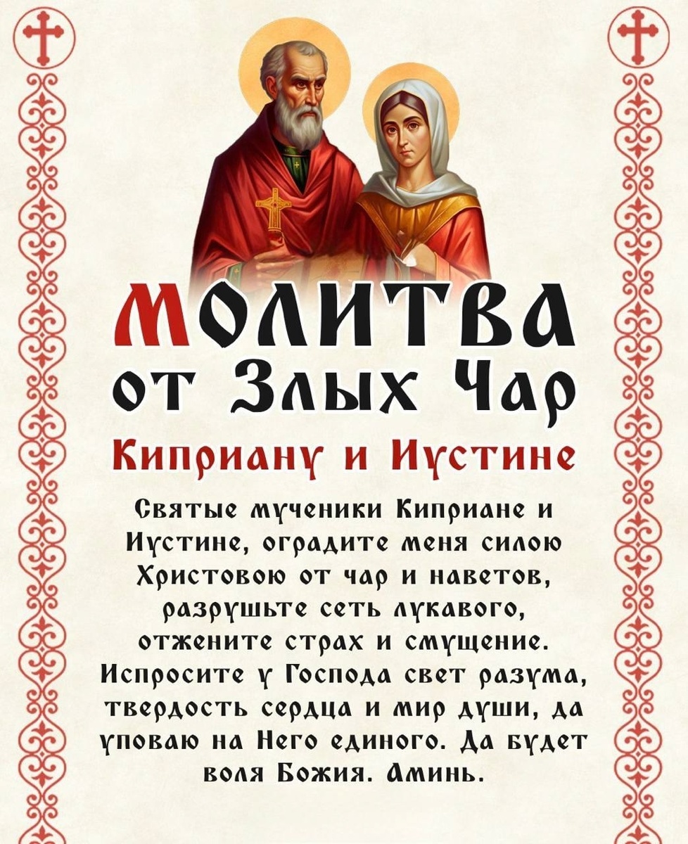Святые мученики Киприан и Иустина — УГОДНИКИ БОЖИИ, к которым с ВЕРОЙ и УПОВАНИЕМ обращаются в час напасти, особенно когда на человека направлены злые чары, порчи, сглазы и иная невидимая нечисть.