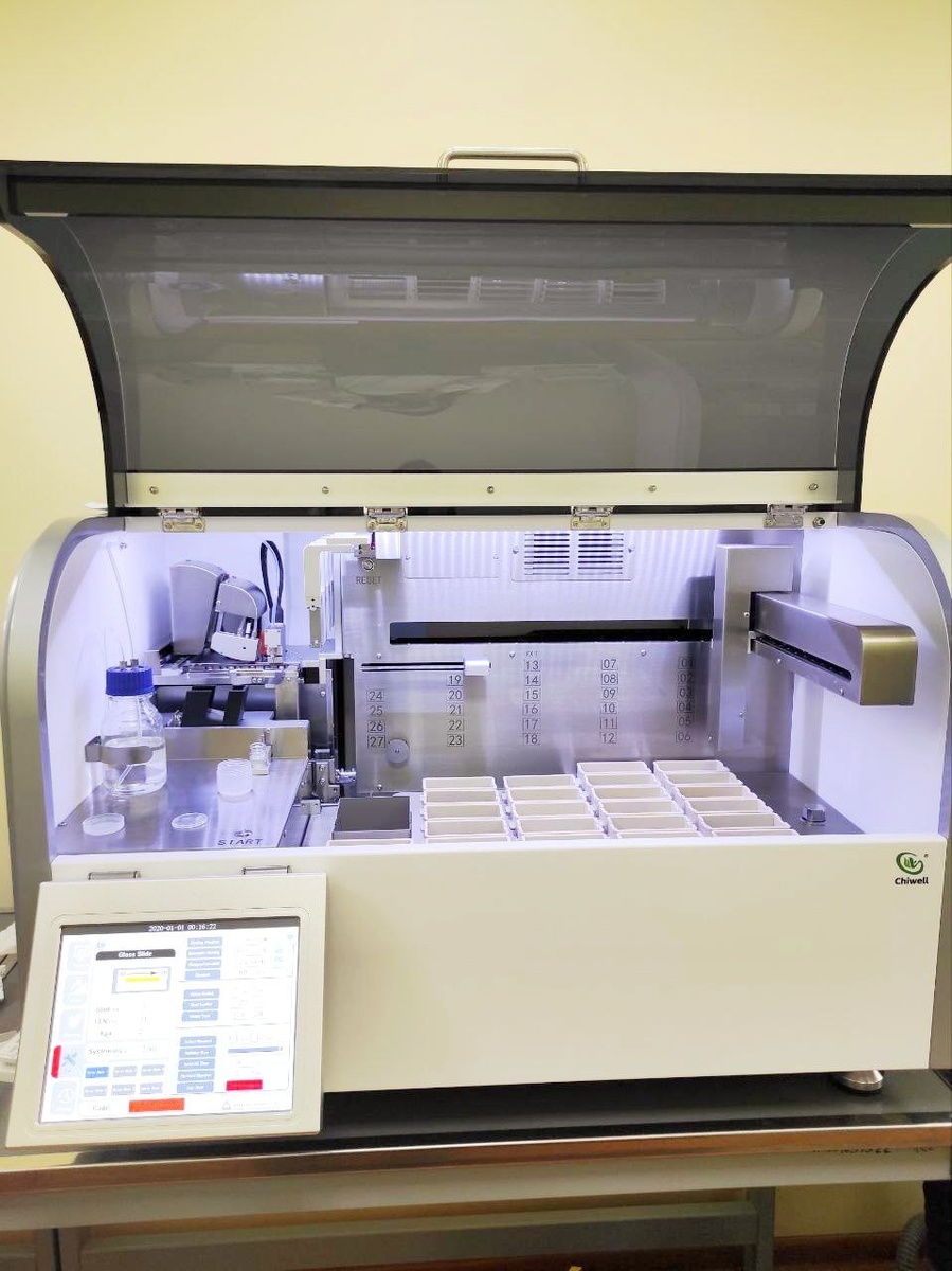 💥 Многие лаборанты только мечтают о полностью автоматизированном процессе окрашивания и заключения микропрепаратов, который экономит время и гарантирует качество. В ГАУЗ «Челябинский областной клинический центр онкологии и ядерной медицины» такое решение есть! Аппарат для окрашивания и заключения микропрепаратов Е7 Chiwell объединяет в себе мультистейнер и модуль для заключения образцов под покровное стекло в одном компактном корпусе. ✅ Перемещение стёкол из окраски в заключение происходит автоматически, полностью исключая участие лаборанта и минимизируя риск ошибок. ✅ Компактный дизайн позволяет разместить полноценную автоматизированную станцию даже в небольшой лаборатории, освобождая ценный рабочий стол. 🔹Интеллектуальная работа: 50 гибко настраиваемых протоколов с возможностью одновременного окрашивания рутинных и специальных окрасок; сенсорный дисплей, интуитивный интерфейс. 🔹Стабильное качество и безопасность: возможность подогрева реагентов (6 станций) для равномерного окрашив