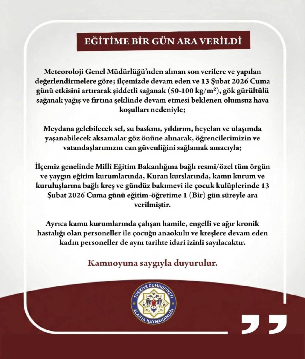 🌧️ В Аланье объявлен выходной в школах 13 февраля