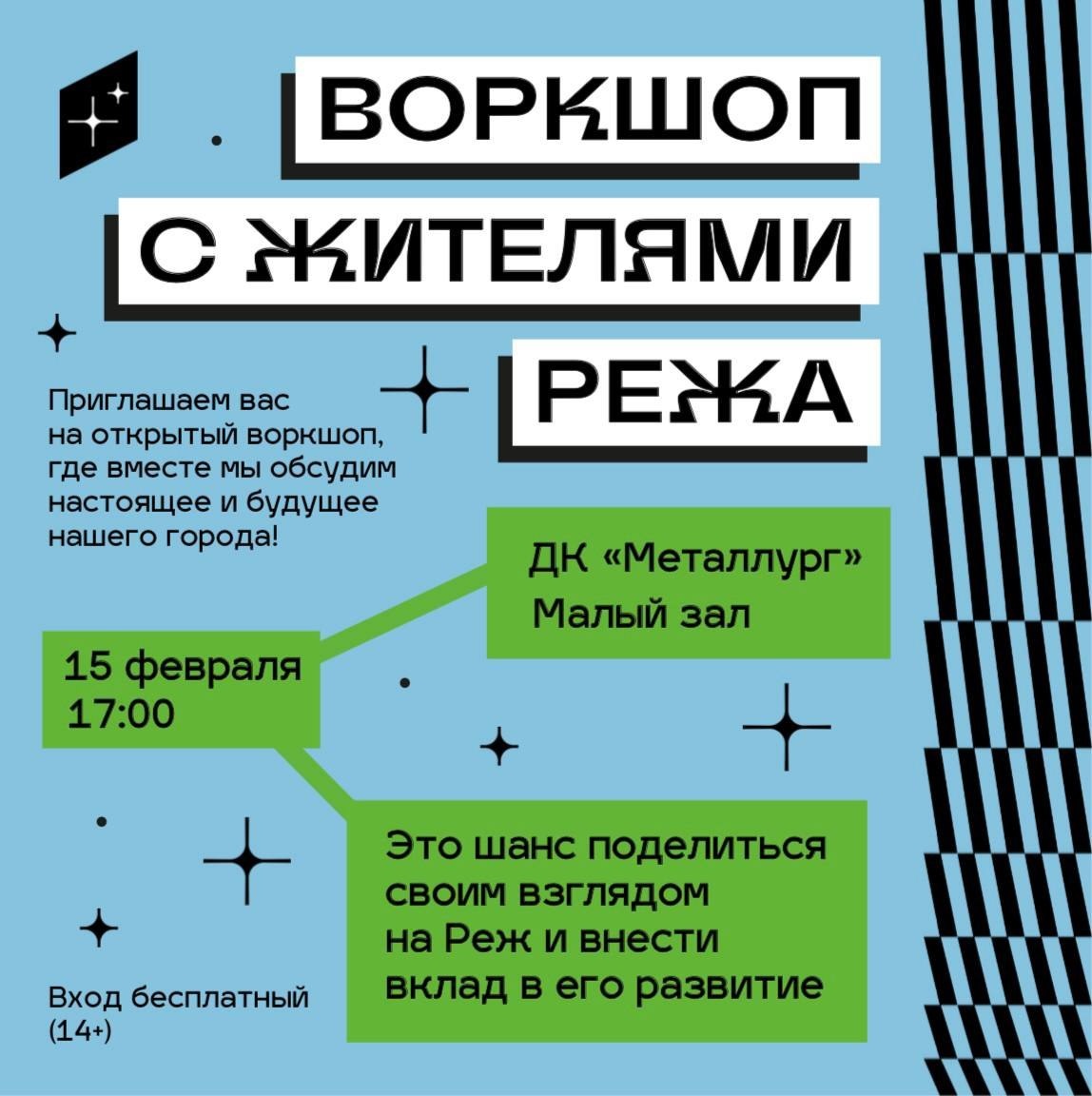 Приглашаем вас на открытый воркшоп, где вместе мы обсудим настоящее и будущее нашего города! Это шанс поделиться своим взглядом на город, узнать его с новой стороны и рассказать, каким вы хотите видеть Реж в ближайшей перспективе. Что будем делать: • Нарисуем карты Режа, отражающие ваше восприятие города: любимые места и символы города, воспоминания о событиях и людях, ценности и идентичность территории. • Сформируем коллективное видение желаемого будущего: каким мы хотим видеть Реж для себя и гостей. Ваши идеи помогут собрать реальные данные для проектов развития Режа. Давайте сделаем наш город именно таким, о каком мечтаем — ждем вас! 15 февраля 17:00 ДК «Металлург» (ул. Костоусова, 82), Малый зал Вход бесплатный, по регистрации https://vk.ru/away.php?to=https%3A%2F%2Fdrugie-knigi.ru%2Flectorium%2F698b15c5f3ac6a0d15bc554f&utf=1 14+