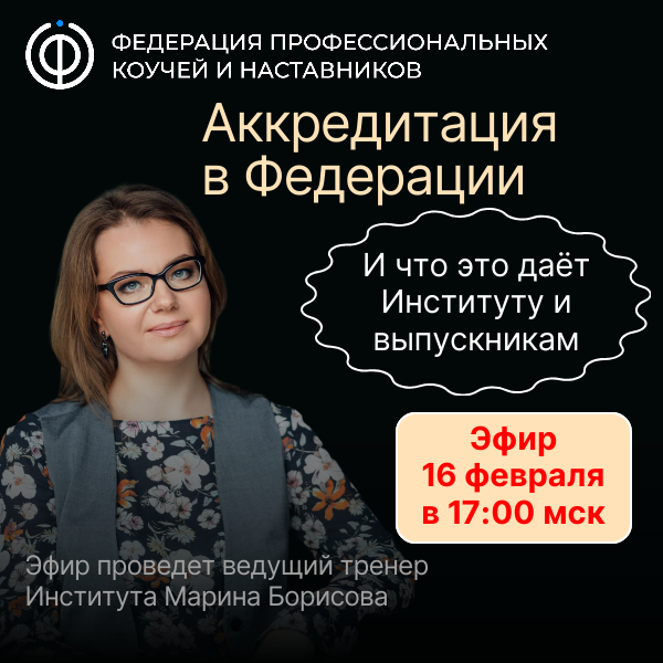 Вчера писали вам о приятных новостях, а сегодня уже анонсируем эфир! Тема – Аккредитация в Федерации профессиональных коучей и наставников (ФПКиН): что она даёт Институту и ее выпускникам. Совсем недавно наша сертификационная программа «Детский и подростковый коучинг», наш флагман Института, прошла аккредитацию в Федерации как программа подготовки к уровню Коуч-Эксперт. - Почему мы вообще решили аккредитовывать программу «Детский и подростковый коучинг"? - Почему для аккредитации мы выбрали именно данную Федерацию? - Новые возможности Института и нашей команды - Какие преимущества аккредитация дает нашим студентам и выпускникам? На эти вопросы тренер Института Марина Борисова ответит на эфире 16 ФЕВРАЛЯ (понедельник) в 17:00 мск. Запишите у себя в календаре эту дату и время. Ссылку на эфир опубликуем за день до эфира, не пропустите!