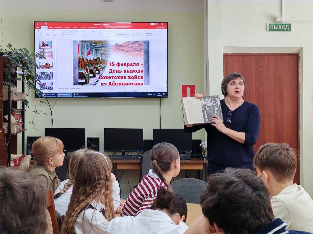 12 февраля в Семикаракорской центральной библиотеке состоялось мероприятие под названием «Имею честь служить тебе, Россия!». Эта встреча в читальном зале была посвящена дню памяти граждан России, выполнявших служебные задачи за рубежом. Сотрудница отдела обслуживания читателей Юлия Александровна Степанова обратилась к подросткам с информацией о выводе советских войск из Афганистана. Дата 15 февраля 1989 года, по ее словам, объединяет в себе чувства скорби по ушедшим соотечественникам, радости возвращения на родину и увековечения памяти о ратных подвигах наших солдат. В сопровождении презентации школьники познакомились с историческими фотографиями тех лет. Ведущая зачитала отрывки из воспоминаний участников тех событий и представила вниманию присутствующих книги: «Афганская война. Боевые операции» В. Рукова, «Афганская война. ГРУ» Г. Тоболяка, «Афганистан, мой путь…» Ю. Матроскина и «Из пламени Афганистана» П. Ткаченко. После этого Юлия Александровна переключила внимание аудитории на со