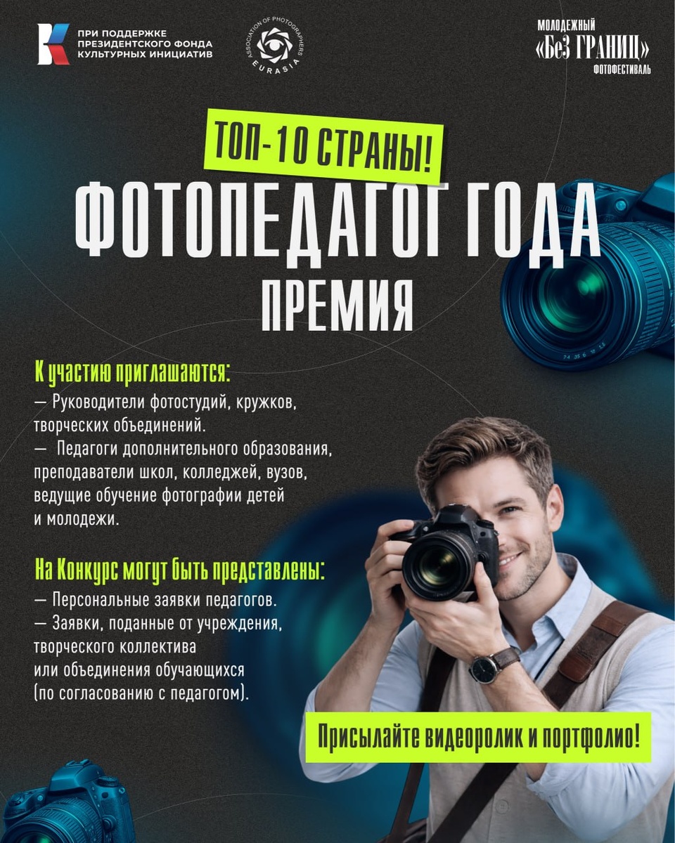 » Премия «Фотопедагог года: топ-10 страны» — конкурс педагогического мастерства в рамках II Международного молодёжного фотофестиваля «Без границ» 🔝 📅 Заявки принимаются с 1 марта по 1 апреля 2026 г. Конкурс проводится в два этапа: – I этап: Прием и оценка конкурсных материалов (видеоролик и портфолио). – II этап: Финальные испытания для лауреатов заочного этапа в формате публичного конкурса (проектного интенсива). 👉 Условия участия и правила подачи заявки на конкурс — в Положении. Проект реализует Ассоциация фотографов «Евразия» при поддержке Президентского фонда культурных инициатив. Под эгидой FIAP. По любым вопросам: eurasia-photo@mail.ru 🤝 Правила подачи заявки опубликованы на странице организатора. Понравился пост? Помоги каналу, подари ⭐️ Написать админу Наши telegram каналы: 1. Фото и видео конкурсы 2. Лучшие фотографии мира 3. Рисунок и дизайн 4. Детские конкурсы