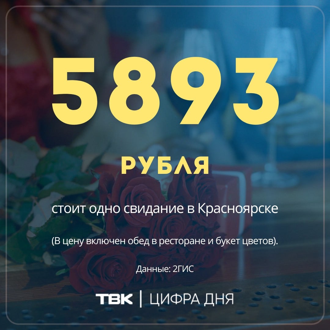 рублей в среднем стоит свидание в Красноярске В эту сумму входит обед в ресторане и букет из 7 роз. По данным 2ГИС, сходить куда-то вдвоем дороже только в Москве (6 975 рублей) и Санкт-Петербурге (5 942 рубля). При этом средний чек в красноярском ресторане выше, чем в Петербурге почти на 400 рублей. Цветы же гораздо дешевле. По информации сервиса, букет в нашем городе стоит 2 207 рублей. А сколько вы в среднем тратите на свидание? ТВК