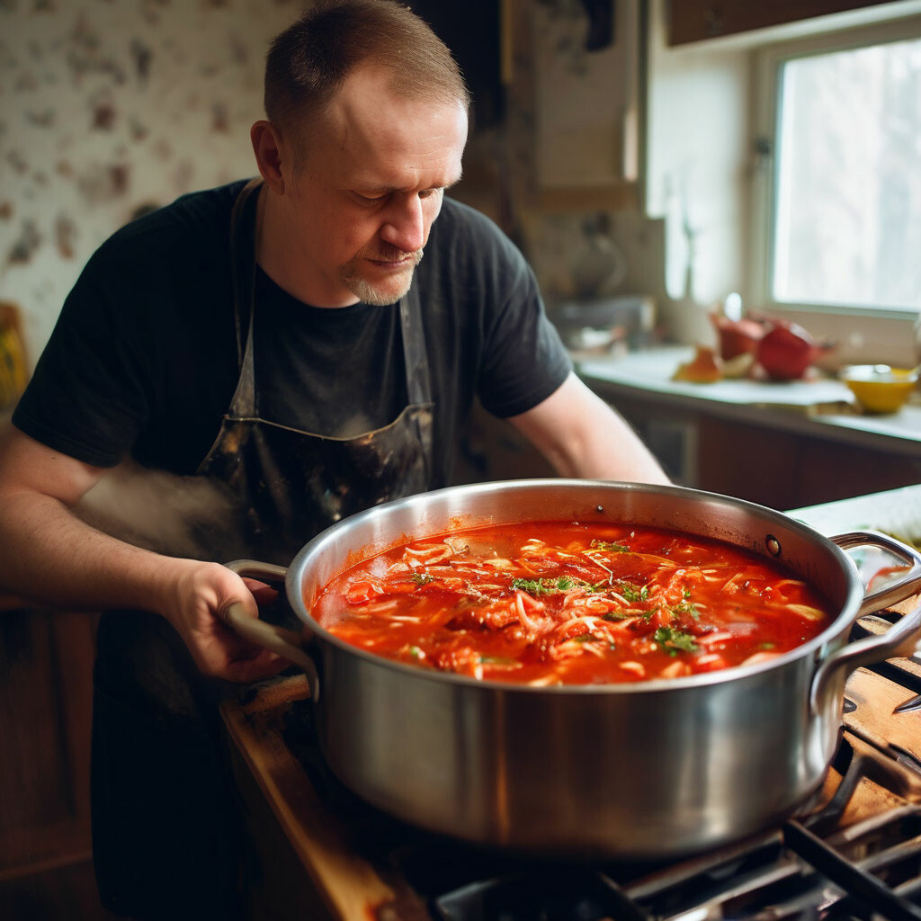 Работа на стройке не располагает к диетическому питанию. За час обеда хочется быстро проглотить обед, поиграть в домино, карты или просто поспать. Еду приносили в банках, разогревали на «трамвайных» печках. Микроволновки появились гораздо позже. Заваривали чай. Иногда приносили с собой, холодный, в капроновых бутылках. Забудешь такую бутылку на пару дней, потом нюхнёшь, то, что в ней получилось и сразу понятно, здоровья там нет совсем. Позже я стал раз в месяц варить суп. Как я его сам называл – «Чистиловка». Этот рецепт я создал сам, путём многолетнего опыта. Может он только на меня так действует. Не знаю. Можете попробовать, вдруг и вам поможет избавиться от всякой скверны накопившейся в организме. Теперь сам рецепт. Вечером в пятницу, ставим на газ большую кастрюлю, литров 5-6. Наливаем почти полную воды. Насыпаем туда луковую шелуху. Приблизительно от 5ти луковиц. Когда вода закипит, ставим на самый слабый огонь. Варим до тех пор, пока листочки лука не станут прозрачными. Получивш