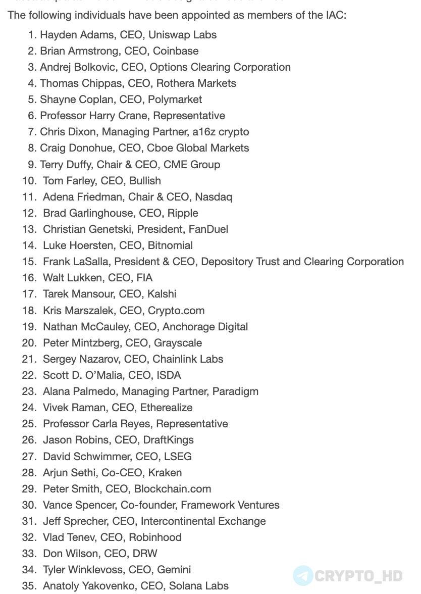 ). ΠΡΠ΅ ΡΡΠ°ΡΡΠ½ΠΈΠΊΠΈ: βͺΠ₯Π΅ΠΉΠ΄Π΅Π½ ΠΠ΄Π°ΠΌΡ (CEO Uniswap Labs #UNI) βͺΠΡΠ°ΠΉΠ°Π½ ΠΡΠΌΡΡΡΠΎΠ½Π³ (CEO Coinbase #COIN) βͺΠΠ½Π΄ΡΠ΅ΠΉ ΠΠΎΠ»ΠΊΠΎΠ²ΠΈΡ (CEO Options Clearing Corporation) βͺΠ’ΠΎΠΌΠ°Ρ Π§ΠΈΠΏΠΏΠ°Ρ (CEO Rothera Markets) βͺΠ¨Π΅ΠΉΠ½ ΠΠΎΠΏΠ»Π°Π½ (CEO Polymarket) βͺΠΡΠΎΡΠ΅ΡΡΠΎΡ ΠΠ°ΡΡΠΈ ΠΡΠ΅ΠΉΠ½ (Representative) βͺΠΡΠΈΡ ΠΠΈΠΊΡΠΎΠ½ (ΡΠΏΡΠ°Π²Π»ΡΡΡΠΈΠΉ ΠΏΠ°ΡΡΠ½Π΅Ρ a16z crypto) βͺΠΡΠ΅ΠΉΠ³ ΠΠΎΠ½ΠΎΡ