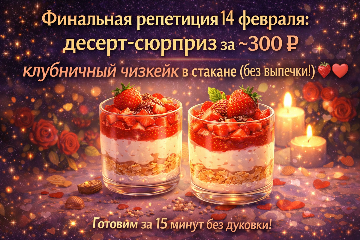 Сегодня — финальная репетиция десерта к 14 февраля. Завтра уже праздник, так что готовим что-то лёгкое, красивое, без духовки и без лишних нервов. Клубничный чизкейк в стакане (или баночке) — идеальный вариант: собирается за 15 минут, охлаждается в холодильнике, выглядит празднично и стоит ~300 ₽ на двоих (цены 2026 года, по акциям). Десерт-сюрприз: клубничный чизкейк в стакане (без выпечки) Ингредиенты на двоих (~300 ₽): Как готовить шаг за шагом: Подача и атмосфера: