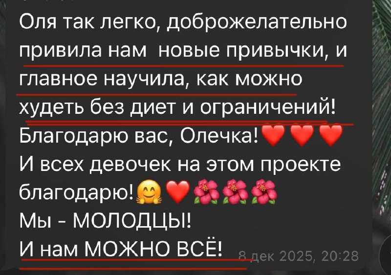 И я худею🔥 Знакомьтесь, Надежда, участница прошлого потока «МОЖНО ВСЕ» Она не была в отчаянии. Не было +20 кг. Не было жёстких диагнозов. Было другое, думаю многим это знакомо: «Самочувствие у меня сейчас неплохое, но хотелось бы лучше. Появились лишние кг, стало тяжело, энергии мало. Питание более-менее нормальное в основные приёмы, но вечером очень хочется сладкого». «Мне не хватает дисциплины, поддержки и структуры. Вес уходит и возвращается. Вечером тянет на сладкое». Чаще всего что мы предпринимаем: ➖Диета. ➖Неделя энтузиазма. ➖Срыв. ➖Вина. ➖Возврат веса с бонусом. Но мы конечно пошли другим путём: ✅ Мы выстроили полноценное питание, где стали себя кормить ✅ Вернули контакт с телом и начали снова слышать сигналы. ✅ Нашли, что мешало двигаться к результату. ✅ Ушли от запретов и научились есть вкусности. Не зря же проект называется «Можно всё». «Мне очень нравится наше пространство, где нам можно всё! И мы хорошеем при этом 🔥🌺 Благодарю Олю и всех девочек! ❤️❤️❤️» И