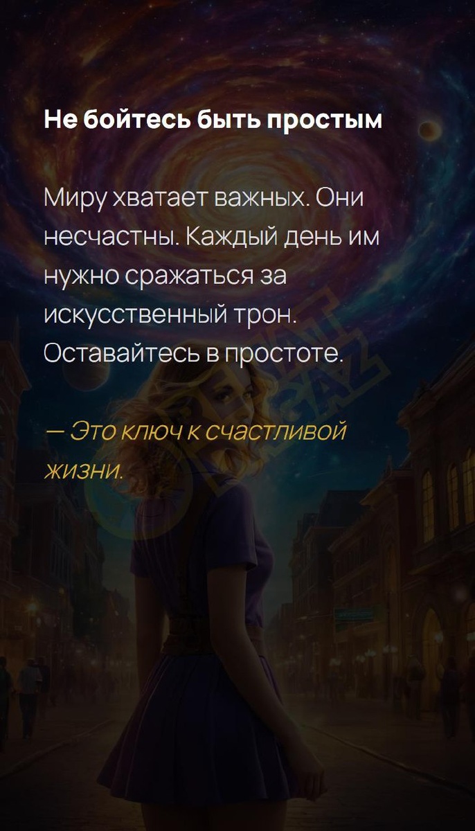 Они несчастны. Каж... Не бойтесь быть простым Миру хватает важных. Они несчастны. Каждый день им нужно сражаться за искусственный трон. Оставайтесь в простоте. — Это ключ к счастливой жизни. Архитектура вашей души | Натальная карта T | VK | Pin | YouTub | Dzen #блог #мудрость #денежныйпоток #радость #красотаизнутри #целостность #перепрошивка #бытьсобой #встреча #13число #13февраля