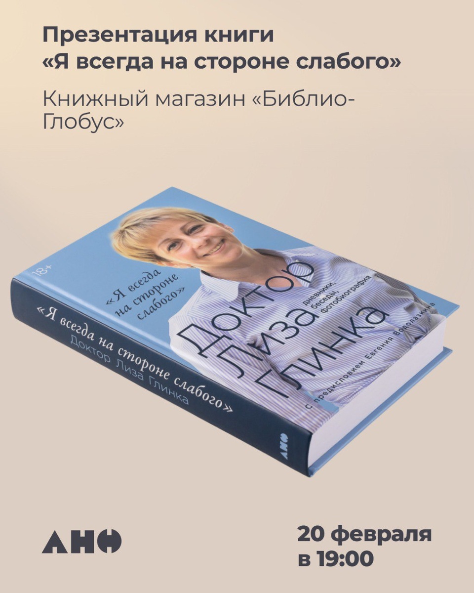 💡20 февраля в 19:00 партнёр Первой премии «Лидеры продвижения культуры инклюзии» Форума Доноров — Издательство «Альпина нон-фикшн» — проведёт памятную встречу, посвящённую Елизавете Глинке, и презентацию книги «Я всегда на стороне слабого: дневники, беседы, фотобиография». В основу издания легли дневники Доктора Лизы и её интервью, в которых она рассказывает о создании и работе международной организации «Справедливая помощь», о своих подопечных и немного о себе. Модератор встречи — Анна Макарчук, член Совета Форума Доноров, директор Центра толерантности в Еврейском музее. В презентации примут участие: • Евгений Водолазкин, писатель, литературовед, лауреат премий «Большая книга» и «Ясная Поляна», автор предисловия к книге • Глеб Глинка, муж Елизаветы Глинки • Наталья Авилова, глава благотворительного фонда «Доктор Лиза» Участники