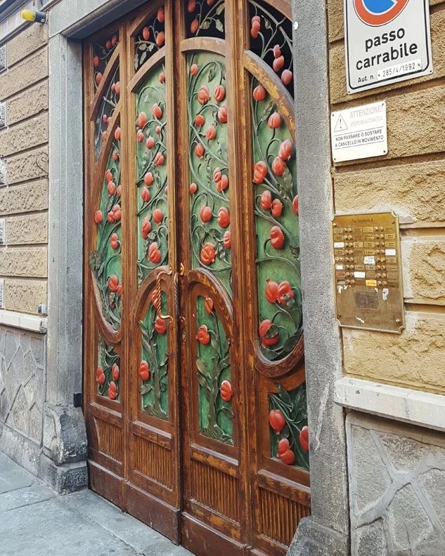 - Шедевр Фенольо со временем начал «теряться» в фасадной гамме — пока реставраторы не вернули ему цвет и контраст. Красный гранат и зелёные листья сделали ворота читаемыми в городе, где на каждом шагу — ещё одна история модерна.