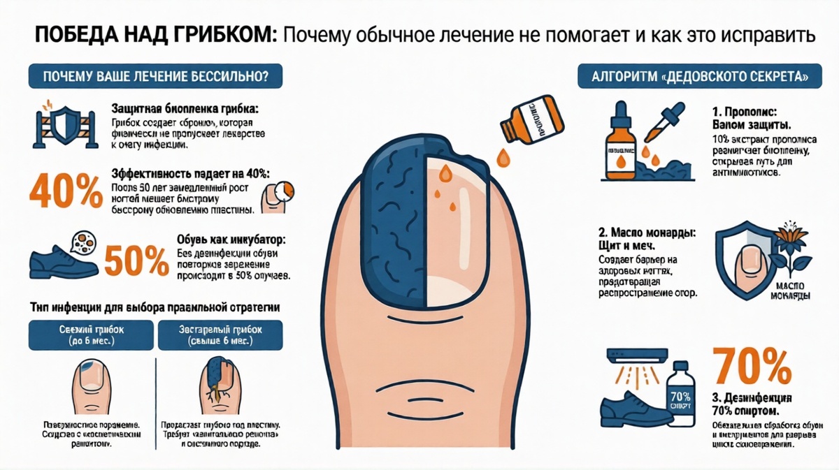 Многие годами ведут изматывающую войну с грибком ногтей. Аптечные полки пустеют, бюджет истощается, а результат — нулевой. Знакомо? Вы мажете, капаете, даже принимаете агрессивные препараты, но ноготь остается таким же тусклым, желтым и деформированным. Часто в этом возрасте (особенно после 50 лет) кажется, что это приговор, связанный со старением. Однако проблема не в вашей дисциплине и не всегда в качестве препарата. Как врач с 10-летним стажем, я скажу прямо: ваш враг научился строить «биологические бункеры», через которые не пробьется ни одно стандартное лекарство. Биопленки — невидимый щит паразита. Главный секрет живучести грибка заключается в том, что он не просто «сидит» в ногтевой пластине. Он создает биопленку — сложную колонию, окруженную защитной оболочкой, напоминающей биологическую броню. Эта «стена» блокирует доступ лекарственных молекул к самому очагу инфекции. Именно поэтому эффективность стандартных схем лечения у зрелых пациентов падает на 40%. Чтобы терапия наконец