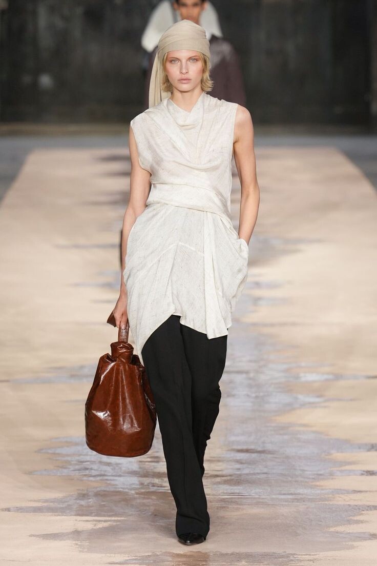 Особенно хорошо читаются модели из текучих тканей. Когда материал не статичен, а двигается, образ автоматически выглядит дороже. Появляется глубина и ощущение стилистической работы, даже если цвет нейтральный.