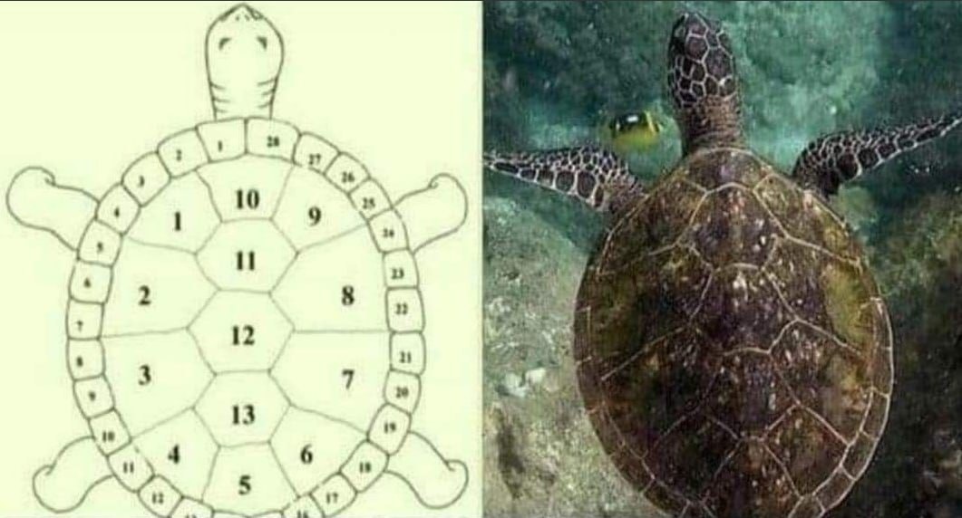 Они представляют собой 28 дней в лунном месяце. В центре панциря вы также увидите более крупные чешуйки, представляющие 13 лун, которые бывают в каждом лунном году. Луна обращается вокруг Земли примерно за 28 дней. Таким образом, за один год Луна обходит вокруг Земли 13 раз. Это дает нам 13 лунных месяцев по 28 дней в каждом Терра инкогнита | Неизвестная земля
