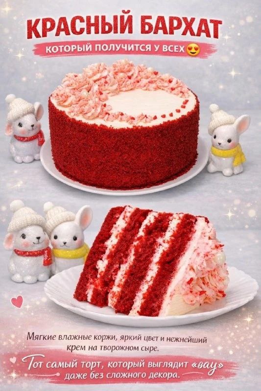 ЯРКИЙ, ВЫСОКИЙ, АККУРАТНЫЙ — НАСТОЯЩИЙ КРАСНЫЙ БАРХАТ ВО ВСЕЙ КРАСЕ. ГОТОВИТСЯ ПРОЩЕ, ЧЕМ КАЖЕТСЯ, А РЕЗУЛЬТАТ ВСЕГДА ВАУ. А КРЕМ С ТВОРОЖНЫМ СЫРОМ ДЕЛАЕТ ЕГО ПРОСТО НЕОТРАЗИМЫМ. ИДЕАЛЬНЫЙ ТОРТ «КРАСНЫЙ БАРХАТ» — ПОЛУЧИТСЯ У ВСЕХ! ❤ Диаметр — 22 см Вес — около 2 кг (без украшения) ИНГРЕДИЕНТЫ: ТЕСТО: ✅ Кефир — 260 г ✅ Красный пищевой краситель — 2–3 ч. л. (по насыщенности) ✅ Сливочное масло — 120 г (мягкое) ✅ Сахар — 250 г ✅ Соль — щепотка ✅ Ванильный сахар — по вкусу ✅ Растительное масло — 50 г ✅ Яйца — 2 средних ✅ Лимонный сок или уксус 6–9% — 1 ч. л. ✅ Мука — 340 г ✅ Какао-порошок — 5 г ✅ Разрыхлитель — 1 ч. л. ✅ Сода — 1/2 ч. л. КРЕМ: ✅ Творожный сыр — 500 г ✅ Сливки от 30% — 400 г ✅ Сахарная пудра — 100 г ✅ Ванильный сахар — 2 ч. л. 👉 По желанию: в прослойку можно добавить джем или ягоды ПРИГОТОВЛЕНИЕ: 1. Все продукты для теста заранее достать, они должны быть комнатной температуры. Духовку разогреть до 170°C. Формы 22 см застелить пергаментом по дну, бортики не смазывать. 2