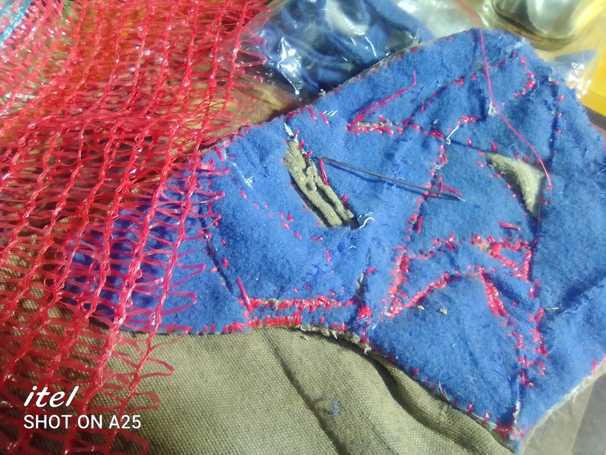 Рабочую поверхность старой рабочей рукавицы "заштопал" кусочками ткани от старого детского пальто, используя халявские нити из сетки для овощей.