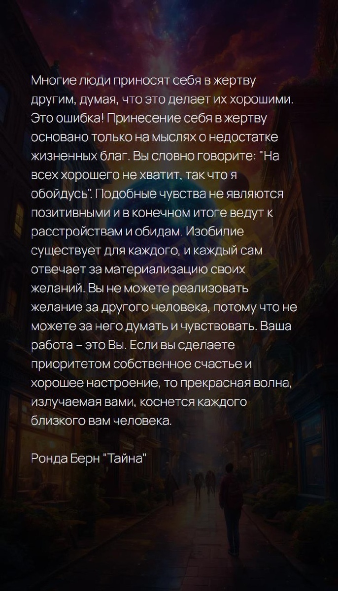 Многие люди приносят себя в жертву другим, думая, что это делает их хорошими. Это ошибка! Принесение себя в жертву основано только на мыслях о недостатке жизненных благ. Вы словно говорите: "На всех хорошего не хватит, так что я обойдусь". Подобные чувства не являются позитивными и в конечном итоге ведут к расстройствам и обидам. Изобилие существует для каждого, и каждый сам отвечает за материализацию своих желаний. Вы не можете реализовать желание за другого человека, потому что не можете за него думать и чувствовать. Ваша работа – это Вы. Если вы сделаете приоритетом собственное счастье и хорошее настроение, то прекрасная волна, излучаемая вами, коснется каждого близкого вам человека. Ронда Берн "Тайна" Архитектура вашей души | Архитектура вашей души T | VK | Pin | YouTub | Dzen #хочувпоток #сегодня #блог #вселеннаяслышит #трансформацияличности #энергетика #нашебудущее #духовныепрактики #магнитдляденег #13число #13февраля
