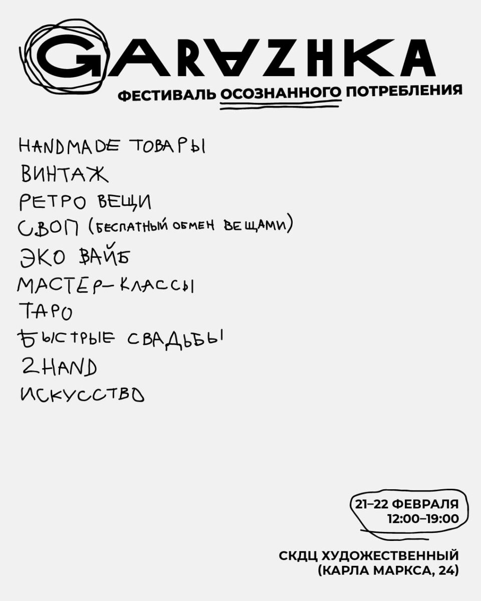 🤍 Garazhka Lagom создает баланс внутри вас, во внешнем мире и природе. Лагом — это по-шведски «в самый раз». Не слишком много. Не слишком мало. Баланс между шумом и тишиной, покупками и осознанностью, развлечением и смыслом. Первая в этом году гаражка пройдет в два дня: 21 и 22 февраля. Основная программа — в карточках 📍 Кроме этого, гостей ждет пункт сбора вторсырья, мастер-классы и лекции, блёстки и беспроигрышная лотерея. 🤍 21–22 февраля (12:00–19:00) 📍 СКДЦ «Художественный», ул. Карла Маркса, 24 #анонсы_иркэдишен