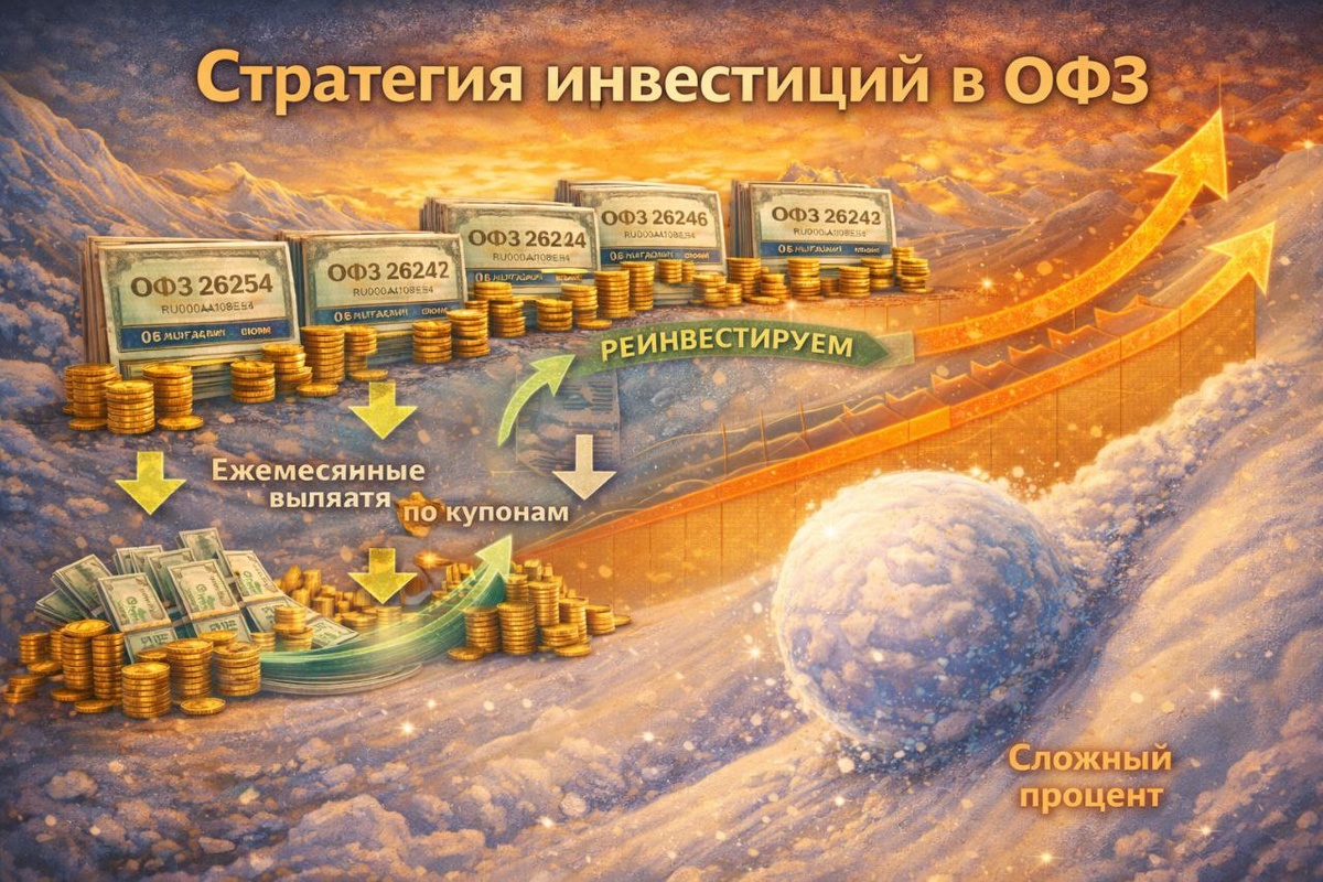 В продолжение к предыдущему посту про ОФЗ я решил написать этот пост про "стратегию" обратите внимание в кавычках. В общем стратегия эта называется в кругу инвесторов в облигации "колесо". Давайте в кратце изложу суть: Нам необходимо получать купоны по облигациям каждый месяц, поэтому мы берём подборку из ОФЗ, про которую я говорил в предыдущем посте и делим свой капитал на равные доли, на которые покупаем эти ОФЗ: — 26254 — 26248 — 26247 — 26246 — 26240 — 26233 Дальше все просто, мы получаем купоны каждый месяц и поровну распределяем полученную сумму между этими выпусками, таким образом сумма пассивного дохода будет расти все быстрее и быстрее. Получается вы сможете воочию учить восьмое чудо света — сложный процент. Важно получать выплаты ежемесячно и реинвестировать их, тогда капитал будет расти не линейно а с ускорением, набирая высоту. (Если представить график) Я бы назвал такую стратегию "снежный ком", потому что если представить горку с которой пустить снежок, то со временем