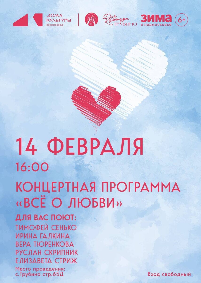 » 😍 Для вас прозвучат самые красивые песни о любви в исполнении талантливых артистов: ♥️ Тимофей Сенько ♥️ Ирина Галкина ♥️ Вера Тюренкова ♥️ Руслан Скрипник ♥️ Елизавета Стриж 📌 14 февраля в 16:00. 📍 ДК «Трубино», стр. 65Д. Вход свободный. #зимавподмосковье #культуращёлково