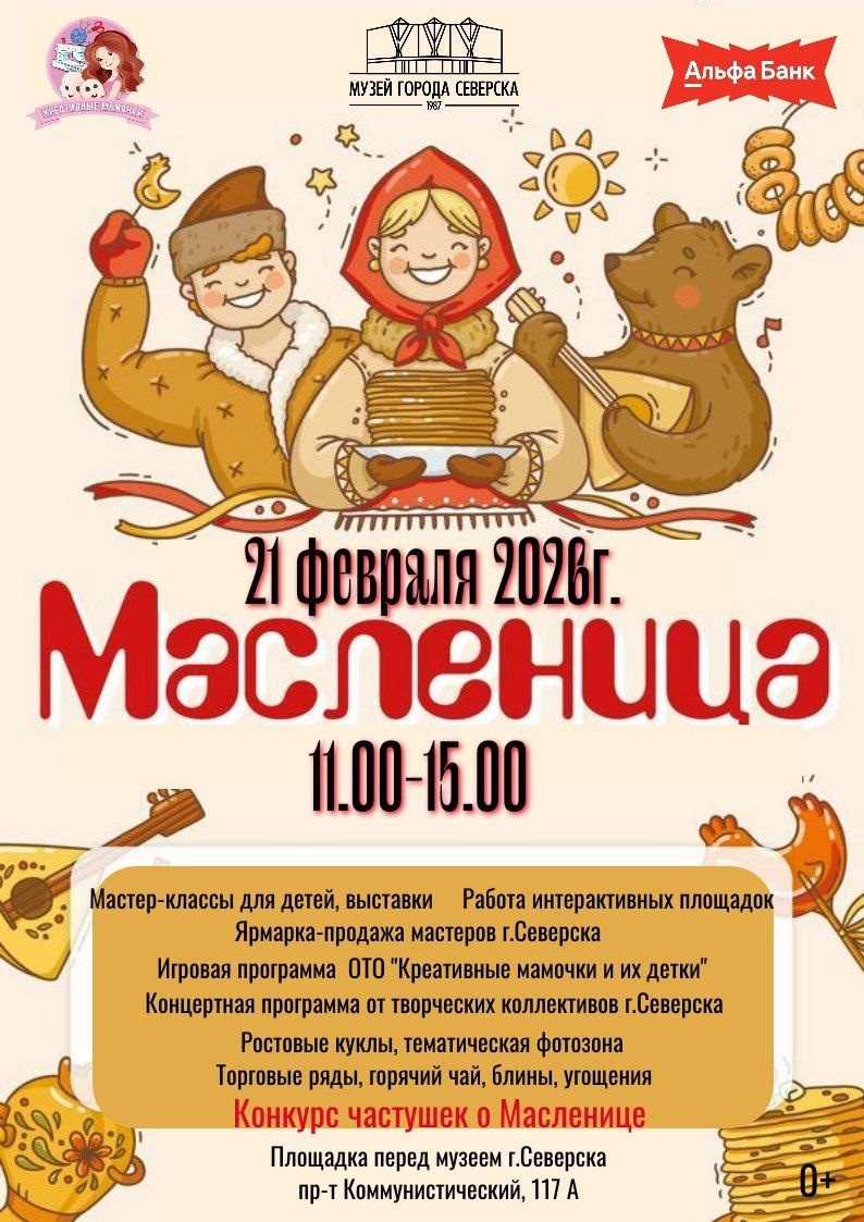 21 февраля с 11:00 до 15:00 на площадке перед музеем г. Северска пройдет настоящий масленичный разгуляй! Что вас ждет: - Мастер-классы для детей — научитесь делать забавные поделки и сувениры. - Выставки — окунитесь в историю и культуру нашего города. - Интерактивные площадки — веселье и развлечения для всех возрастов. - Ярмарка-продажа мастеров г. Северска — уникальные изделия ручной работы. - Игровая программа ОТО «Креативные мамочки и их детки» — море смеха и веселья! Концертная программа от творческих коллективов г. Северска — музыка, танцы и песни. - Ростовые куклы — фотографируйтесь с любимыми персонажами. - Тематическая фотозона — яркие и веселые кадры на память. - Конкурс частушек о Масленице — проявите свой талант и юмор! Не забудьте про главное — блины, горячий чай и угощения! Информация по телефону: 78-52-72. #СеверскАфиша