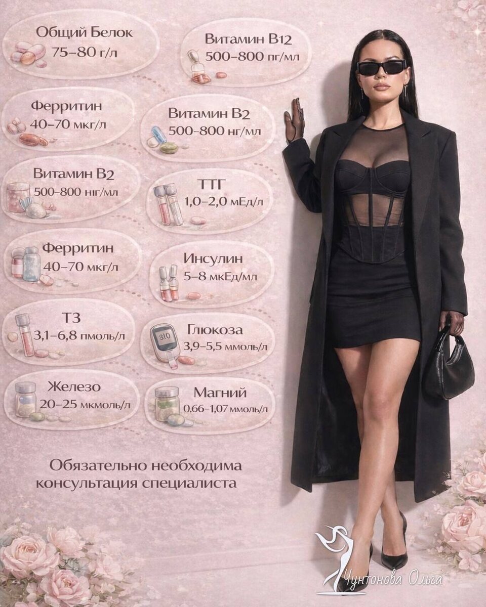Часто вес «стоит», энергии нет, волосы выпадают, а врачи говорят: «У вас всё в норме». На самом деле важно смотреть не просто референсы лаборатории, а оптимальные значения для женского организма. Ключевые показатели: Общий белок — 75–80 г/л Отвечает за обмен веществ, иммунитет, отсутствие отёков. Ферритин — 40–70 мкг/л Низкий = усталость, выпадение волос, холод, тревожность. Витамин B12 — 500–800 пг/мл Энергия, нервная система, концентрация. Витамин B2 — 500–800 нг/мл Кожа, слизистые, работа щитовидной железы. ТТГ — 1,0–2,0 мЕд/л Даже «пограничные» значения могут замедлять метаболизм. Т3 свободный — 3,1–6,8 пмоль/л Активный гормон щитовидной железы. Инсулин — 5–8 мкЕд/мл Повышение = набор веса и тяга к сладкому. Глюкоза — 3,9–5,5 ммоль/л Скачки = переедание и усталость. Железо — 20–25 мкмоль/л Кислород, энергия, выносливость. Магний — 0,66–1,07 ммоль/л Нервная система, сон, снижение стресса. Добавки не работают без питания. Гормоны не восстанавливаются на дефицитах. На моём марафоне