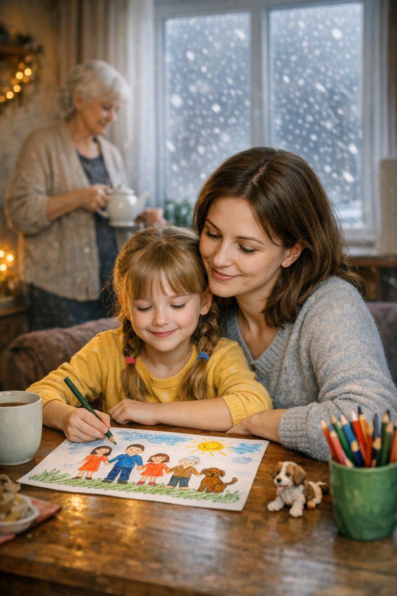 Аня дорисовывает собаку. Мама заваривает свежий чай. За окном всё идёт снег, крупный и тихий, как обещание. Где-то в глубине души маленькая девочка, которая когда-то мечтала уехать в Санкт-Петербург, наконец-то перестаёт ждать поезда. Она уже приехала.