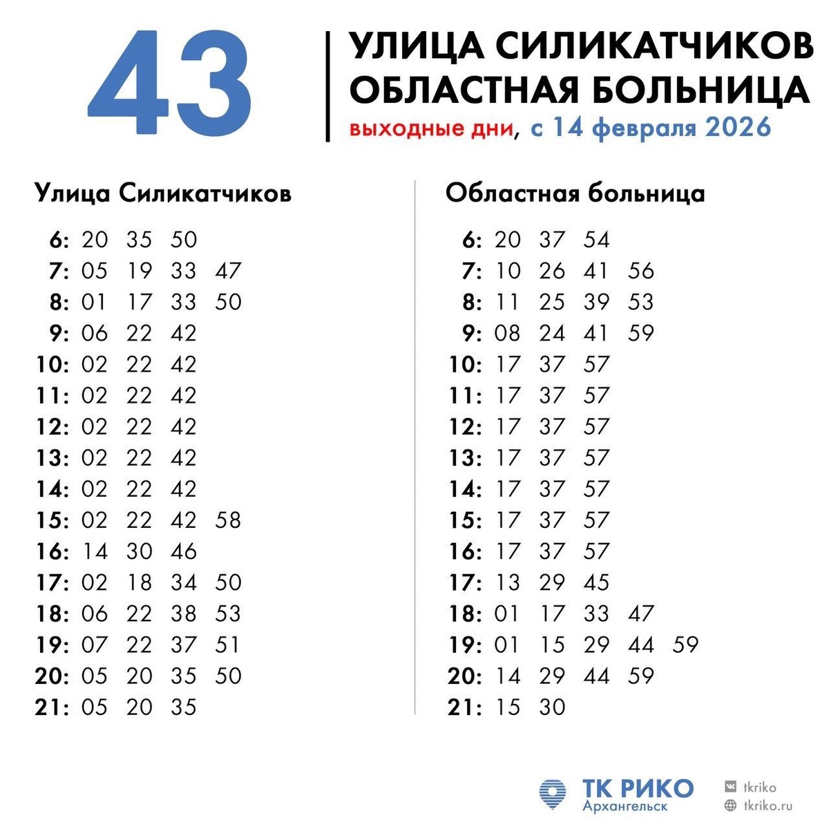 🚌 С 14 февраля изменится расписание маршрута №43 по выходным дням. Количество рейсов останется прежним.