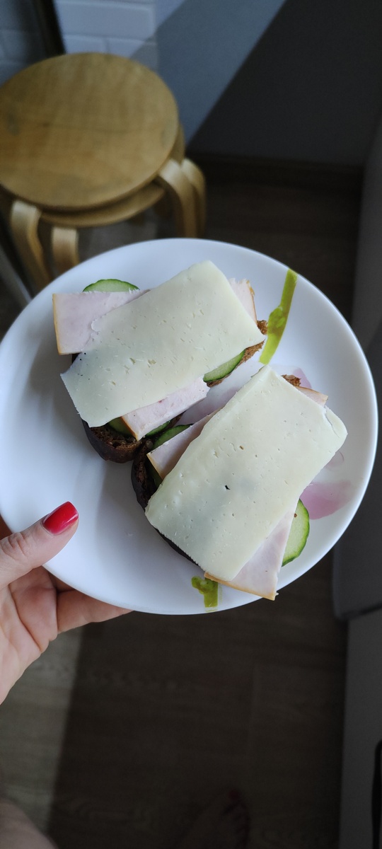 На завтрак бутерброды с бужениной и сыром, немного огурцов