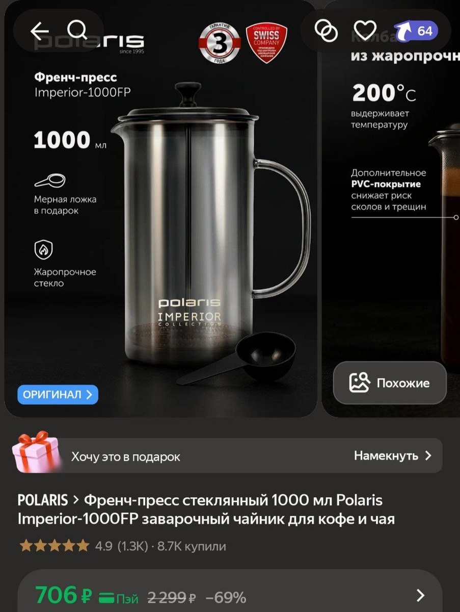 Френч-пресс стеклянный 1000 мл Polaris Imperior-1000FP заварочный чайник для кофе и чая