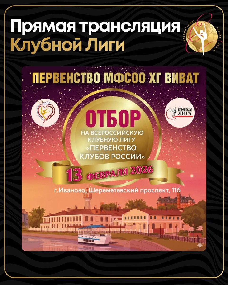 »🏆✨ 13 февраля в Иванове начинаются Межрегиональные соревнования — «Первенство МФСОО ХГ Виват», проходящие в рамках Клубной Лиги. 📍Место проведения: г. Иваново, Шереметьевский просп., д. 116. 🌟Турнир является отборочным этапом на Всероссийскую Клубную Лигу «Первенство Клубов России», которая состоится 16–20 февраля 2026 года в Ульяновске. ✅Всем участницам начисляются рейтинговые очки Клубной Лиги — важный шаг для формирования общего зачёта сезона. 🤝Организатор соревнований — МФСОО ХГ «Виват». ⸻⸻⸻⸻⸻⸻ 🎥ПРЯМАЯ ТРАНСЛЯЦИЯ Следите за выступлениями в режиме реального времени в нашем Telegram-канале: 👉Смотреть прямую трансляцию ⸻⸻⸻⸻⸻⸻ 🖥ОЦЕНКИ В LIVE-РЕЖИМЕ Баллы гимнасток доступны сразу после выставления на онлайн-табло: 👉Смотреть оценки в реальном времени ⸻⸻⸻⸻⸻⸻ ✨Желаем спортсменкам уверенности, точности и ярких выступлений! Борьба за путёвки на всероссийский этап начинается уже сегодня — подключайтесь к эфиру и поддерживайте участниц!💫 —————————————————— Клубная Лига в MAX П