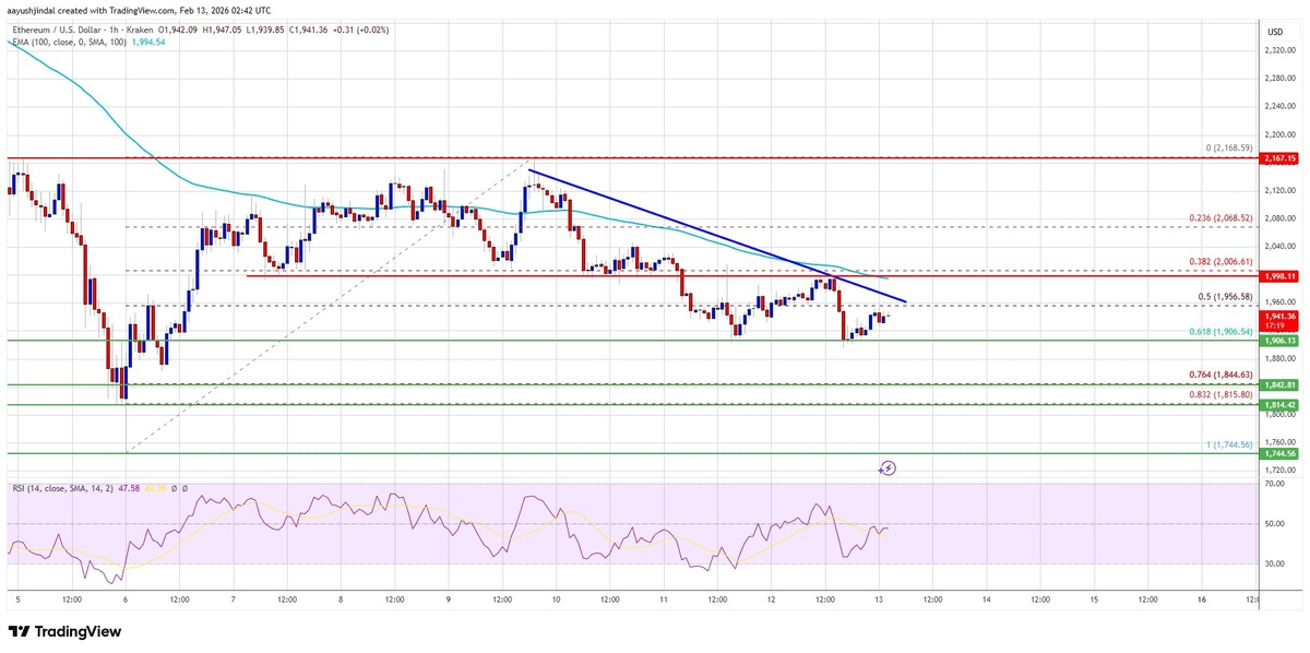? 📉 Цена Ethereum не смогла удержаться выше $2000 и начала новое снижение, торгуясь ниже $1980 и 100-часовой простой скользящей средней. Существует риск дальнейшего падения ниже $1920. 📊 Ключевые моменты: - Текущая цена: Ниже $1980. - Основное сопротивление: $1960, затем $2000 и $2050. - Основная поддержка: $1920, затем $1900 (61.8% Фибо) и $1845. - Индикаторы: MACD набирает медвежий импульс, RSI ниже 50. - Медвежий тренд: Формируется линия сопротивления на $1960. ⚠️ Риски: Если ETH не сможет преодолеть сопротивление $1960, возможно дальнейшее снижение к $1900 и ниже. Горизонт: краткосрочно