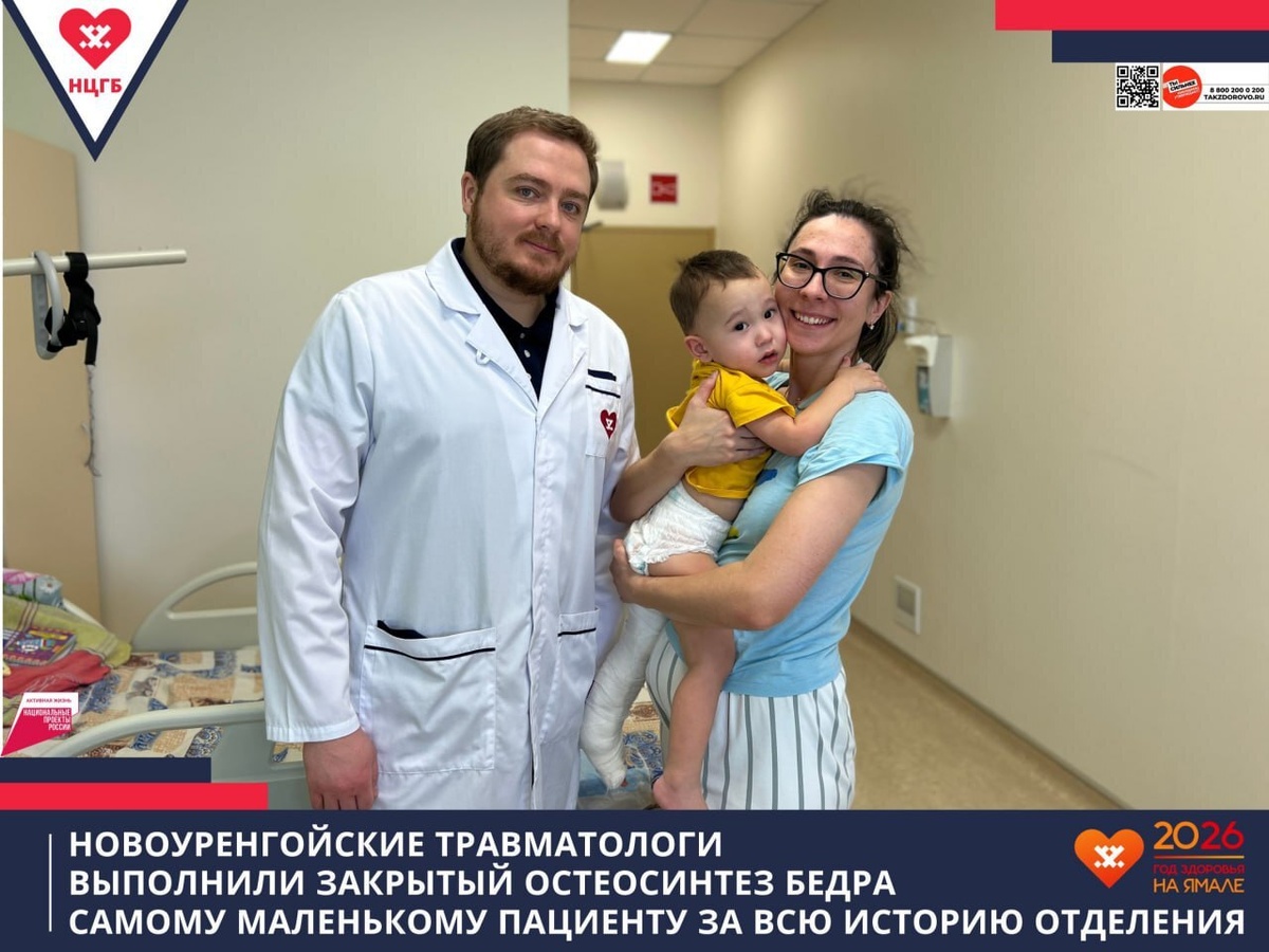 Мальчик Амир (1 год 8 месяцев) поступил в больницу с переломом бедра. Врачи-травматологи Сергей Лазарев и Азер Самедли успешно выполнили закрытый остеосинтез — операцию через 5-миллиметровый разрез в нижней части бедра. С помощью специальных инструментов кость была зафиксирована титановым гибким стержнем. Метод считается «золотым стандартом» лечения переломов бедра у детей. Реабилитация займёт около месяца в гипсе, после чего стержень будет удалён. Благодаря грамотно проведённой операции травма не повлияет на дальнейший рост и качество жизни ребёнка. 📸 Новоуренгойская ЦГБ 🔵Проголосовать за канал ❤️ Импульс Севера | Подписаться в MAX