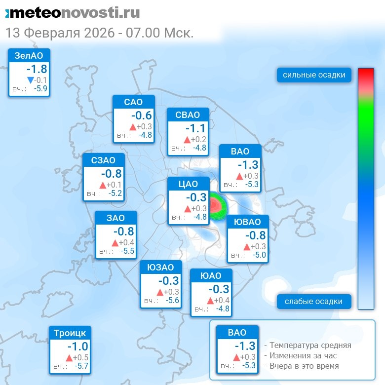В 7:00 в Москве было от -2.2°C до +0.5°C, средняя температура -0.8°C #погода #Москва #зима #температура #13февраля #пятница